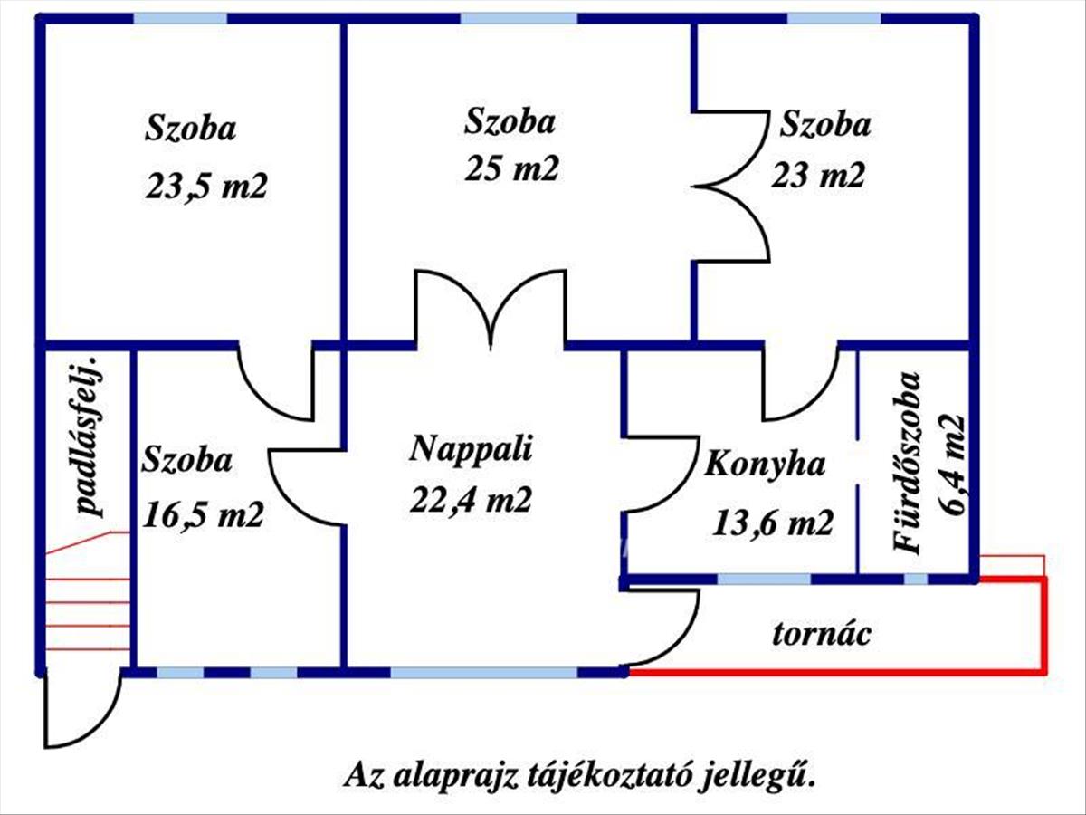 Helyiségei: nappali, 3 utcára néző szoba, egy udvarra néző szoba, konyha, fürdőszoba, ez a lakórész 130, 4 m2, a nappaliba egy kis tornácon keresztül jutunk.