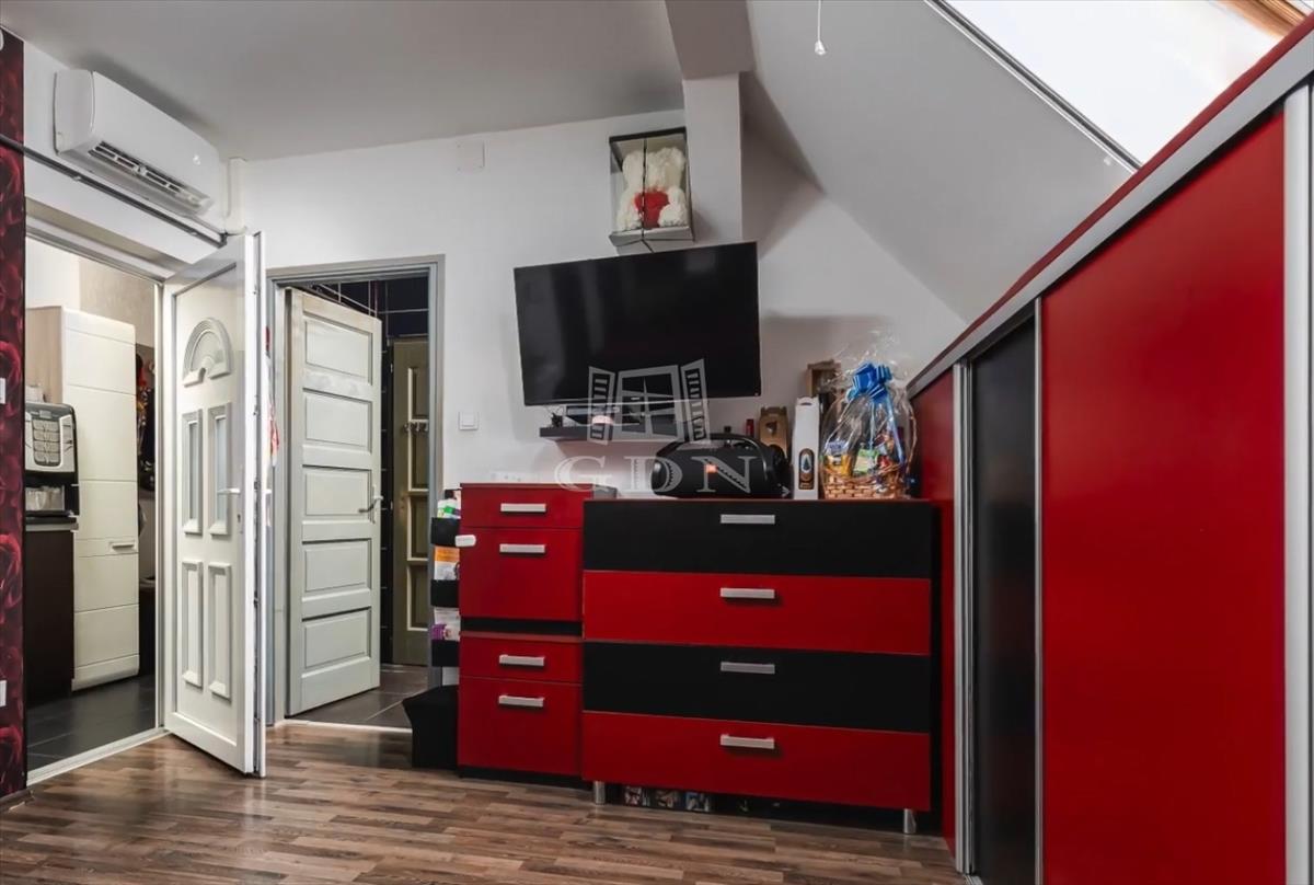 A tetőtérben 2 önálló lakrész kapott helyet: egy 25 nm-es garzon, illetve egy nagyméretű, 3 hálószobás amerikai konyhás lakás, együttesen 130 nm-es területen. Minden szoba inverteres hűtő-fűtő klímával felszerelt, a külső lépcsőterasz pedig önálló bejáratot biztosít.