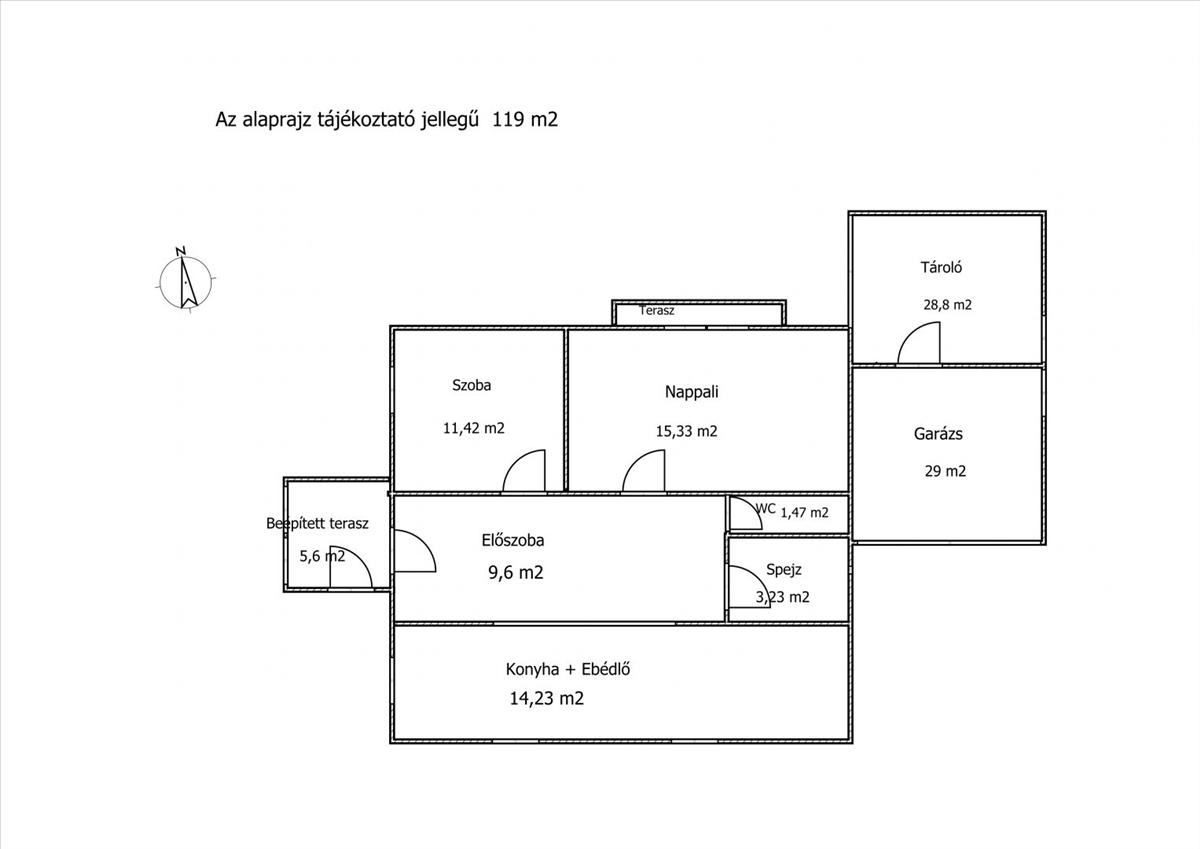 konyha ebédlővel, előszoba, nappali, szoba, kamra, wc, beépített terasz, szerelőaknás garázs és egy tároló.