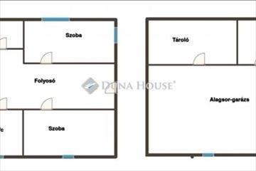 Az ingatlanba belépve egy folyosóra érkezünk, innen balra találunk egy hálószobát és a wc, jobbra nappali kapott helyet, ahonnan egy erkélyre tudunk kijutni, tovább haladva a folyosóval szemben a konyha és az étkező található, innen jobbra a fürdőszoba és még egy hálószobát találunk. a tetőtér még beépíthető így nagy család számára alakítható. Lent az alagsorban van a garázs és egy tároló + kazánház.