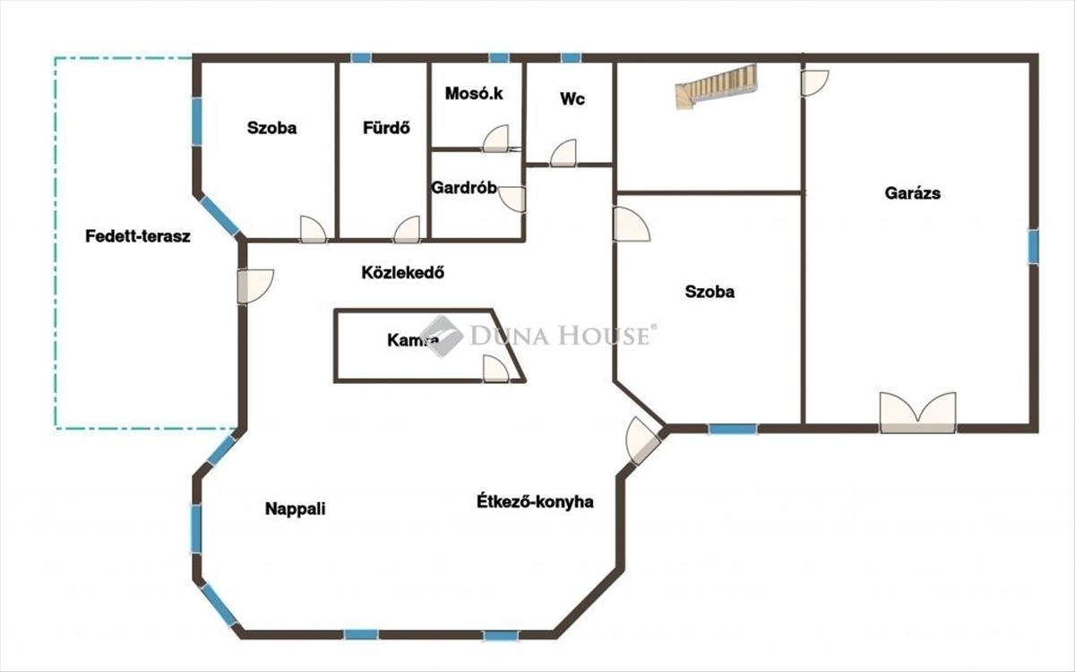 Belépés után az előtérbe érkezünk ahonnan balra egy hálószoba fogad minket, tovább haladva konyha- étkezőbe érkezünk, innen a nappali fogad minket ahonnan kijutunk a fedett teraszra. a bejárattól jobbra van a wc, fürdő, gardrób és egy hálószoba. a ház alatt pedig egy 73nm -es pince található ami remek tároló helyiségekkel vár minket. Az ingatlanban van még egy garázs is. a ház egy nyeles telken helyezkedik el amelyről van társas házi okirat.