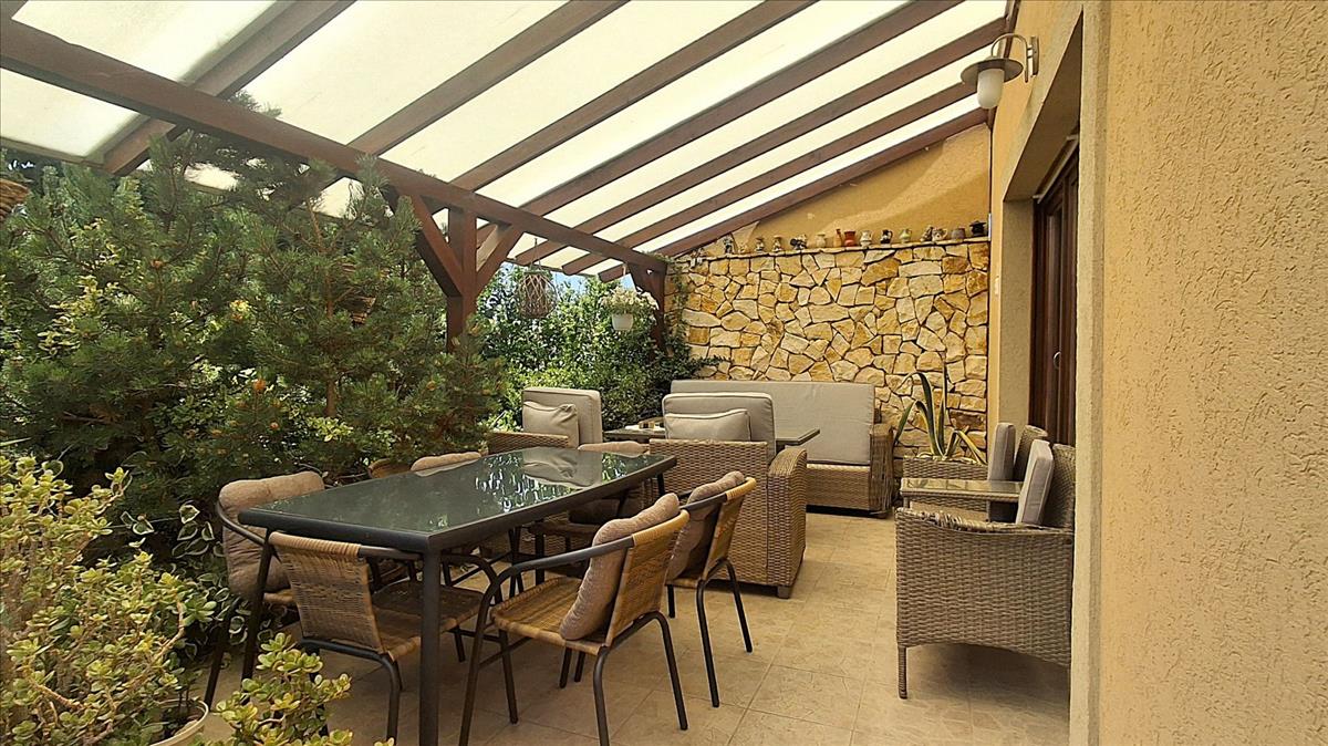 A nappaliból közvetlen kijárat nyílik a déli fekvésű, 20 m²-es fedett teraszra, amely kiváló helyszín lehet a reggeli kávéhoz vagy családi összejövetelekhez – a polikarbonát tető véd az időjárás viszontagságaitól.