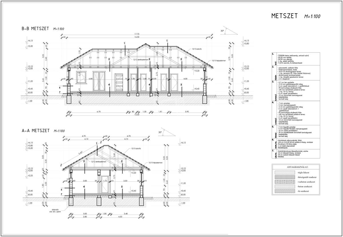 A tető héjazata antracit betoncserép lesz, a homlokzatok 15cm eps, a padló 10cm Austrotherm AT-N100-as, a vízszintes födém 30cm Ásványgyapot szigeteléssel lesz ellátva.