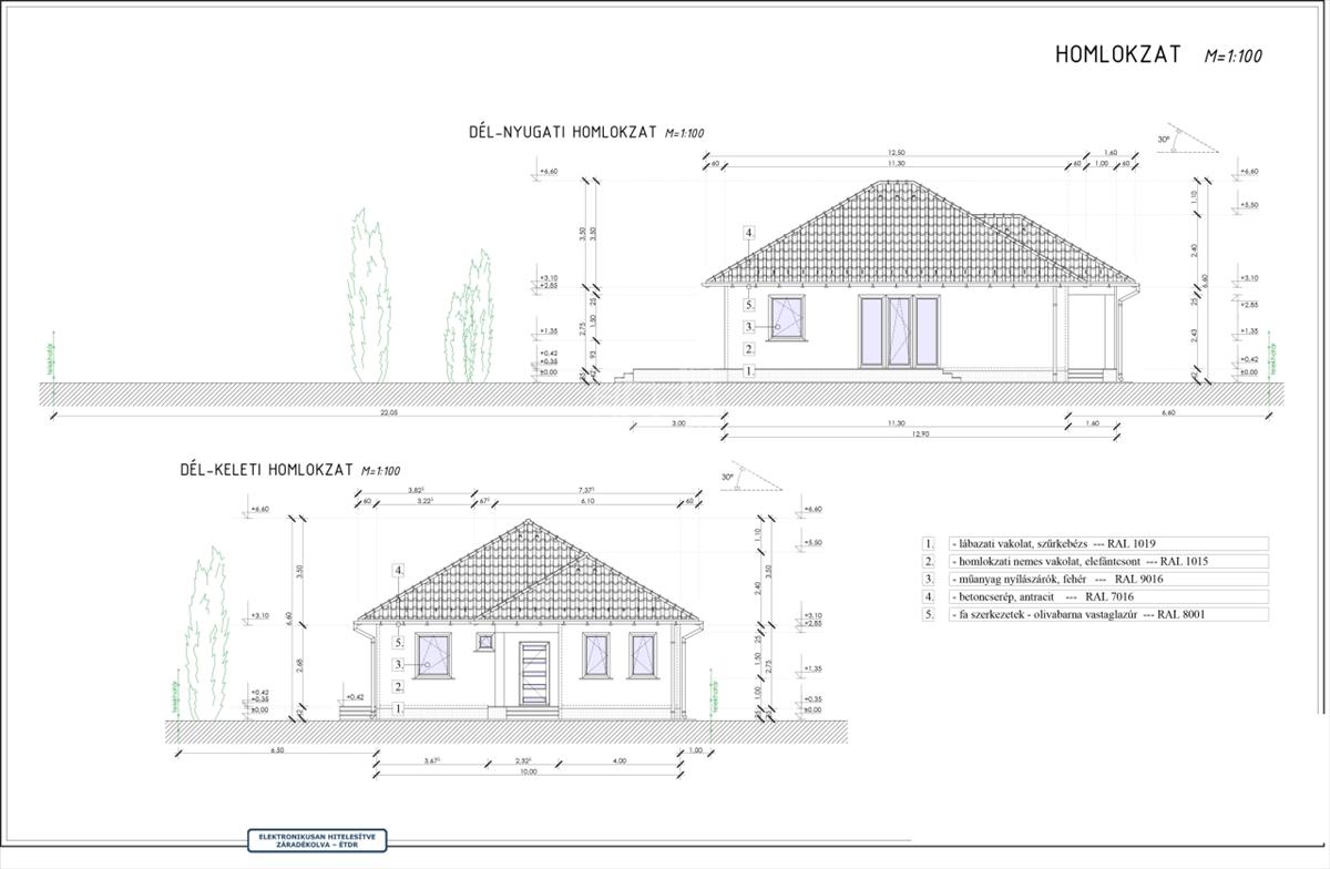A tető héjazata antracit betoncserép lesz, a homlokzatok 10cm Grafitos eps, a padló 10cm Austrotherm AT-N100-as, a vízszintes födém 30cm Ásványgyapot szigeteléssel lesz ellátva.