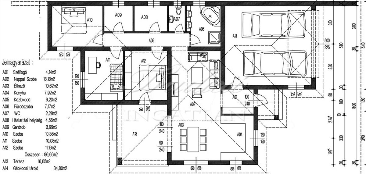 A bruttó 150 m2-es ingatlan nettó 96, 66 m2-es lakótérből, 34, 80 m2-es két gépjármű kényelmes parkolására alkalmas garázsból és egy fényben úszó, 18, 66 m2-es teraszból áll.