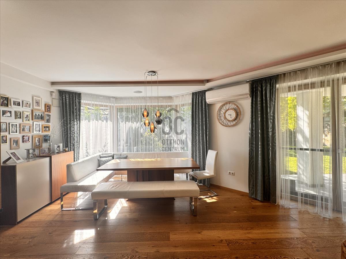 Az épület költséghatékony működésű, és az élettér része minden napszakban ragyogóan világos, köszönhetően K-DNY-i tájolásának. a napfényes nappaliból egyenesen az ingatlan teraszára léphetünk, majd átélhetjük a gondosan parkosított kert varázsát, ahol szauna, kerti grillterasz és automata öntözőrendszer gondoskodik a lakók kényelméről.