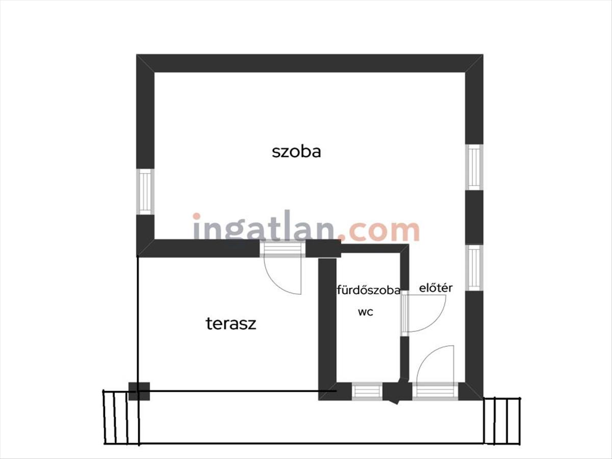 Tagolása: előszoba (2, 3 nm ), fürdőszoba wc-vel (2, 9 nm ), szoba (16, 9 nm ), terasz (7 nm ).
