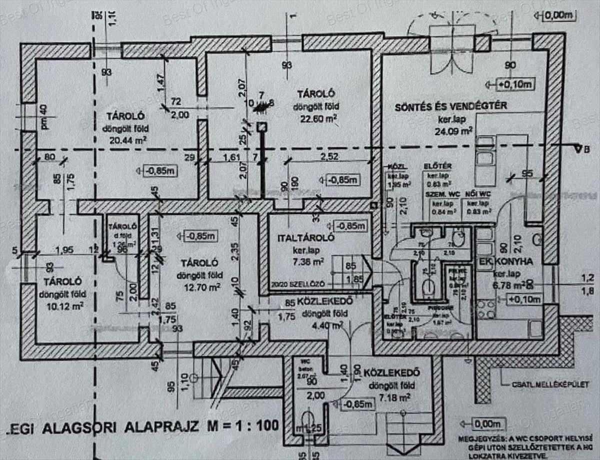 Az alsó szint (szuterén rész, mely két külön bejárattal rendelkezik) elosztása: több helyiségből, vizesblokkból, konyhából és üzlethelyiségből áll.