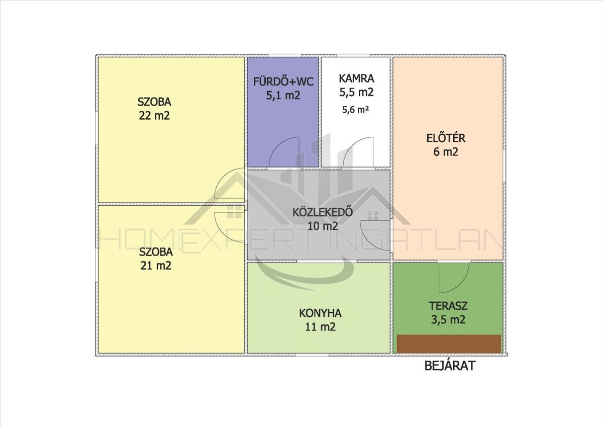 Szélfogó (3, 5 m2), előtér (6 m2), közlekedő (10 m2), 2 szoba (21 m2, 22 m2), konyha (11 m2), fürdő +wc (5, 1 m2), kamra (5, 4 m2). Lásd alaprajz.