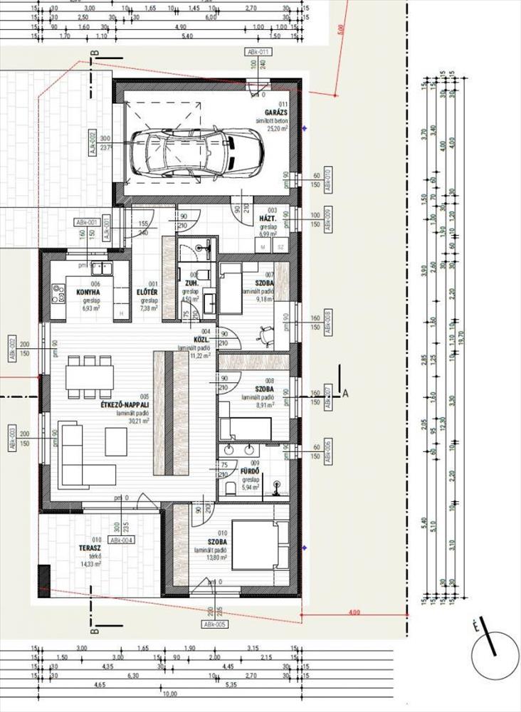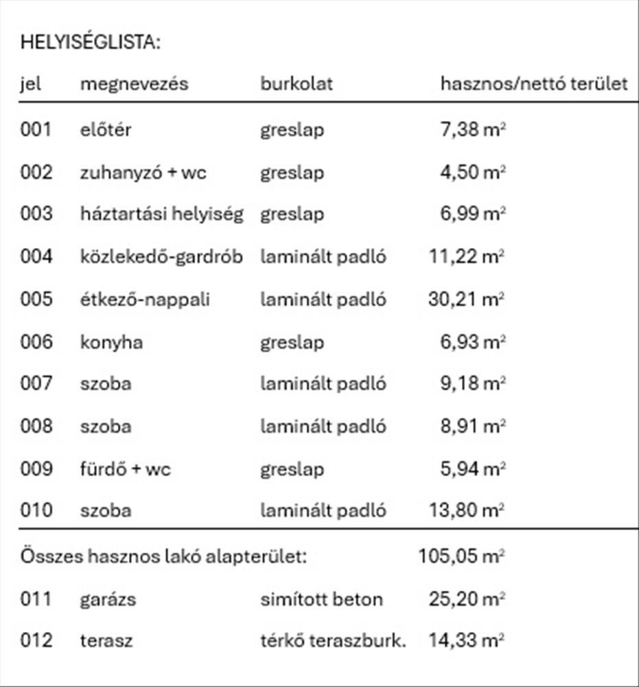 Tagolása: előtér (7, 38 nm ), zuhanyzó + wc (4, 5 nm ) háztartási helyiség (6, 99 nm ), közlekedő-gardrób (11, 22 nm ), étkező-nappali (30, 21 nm ), konyha (6, 93 nm ), szoba (9, 18 nm ), szoba (8, 91 nm ), fürdő + wc (5, 94 nm ), szoba (13, 8 nm )
