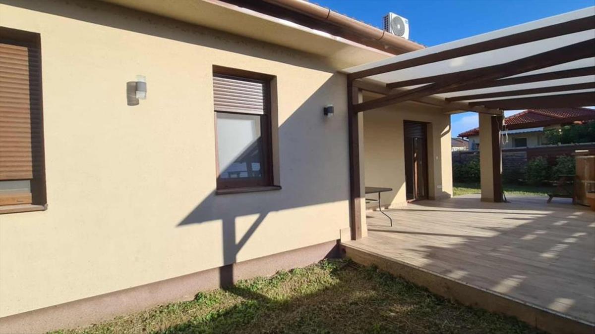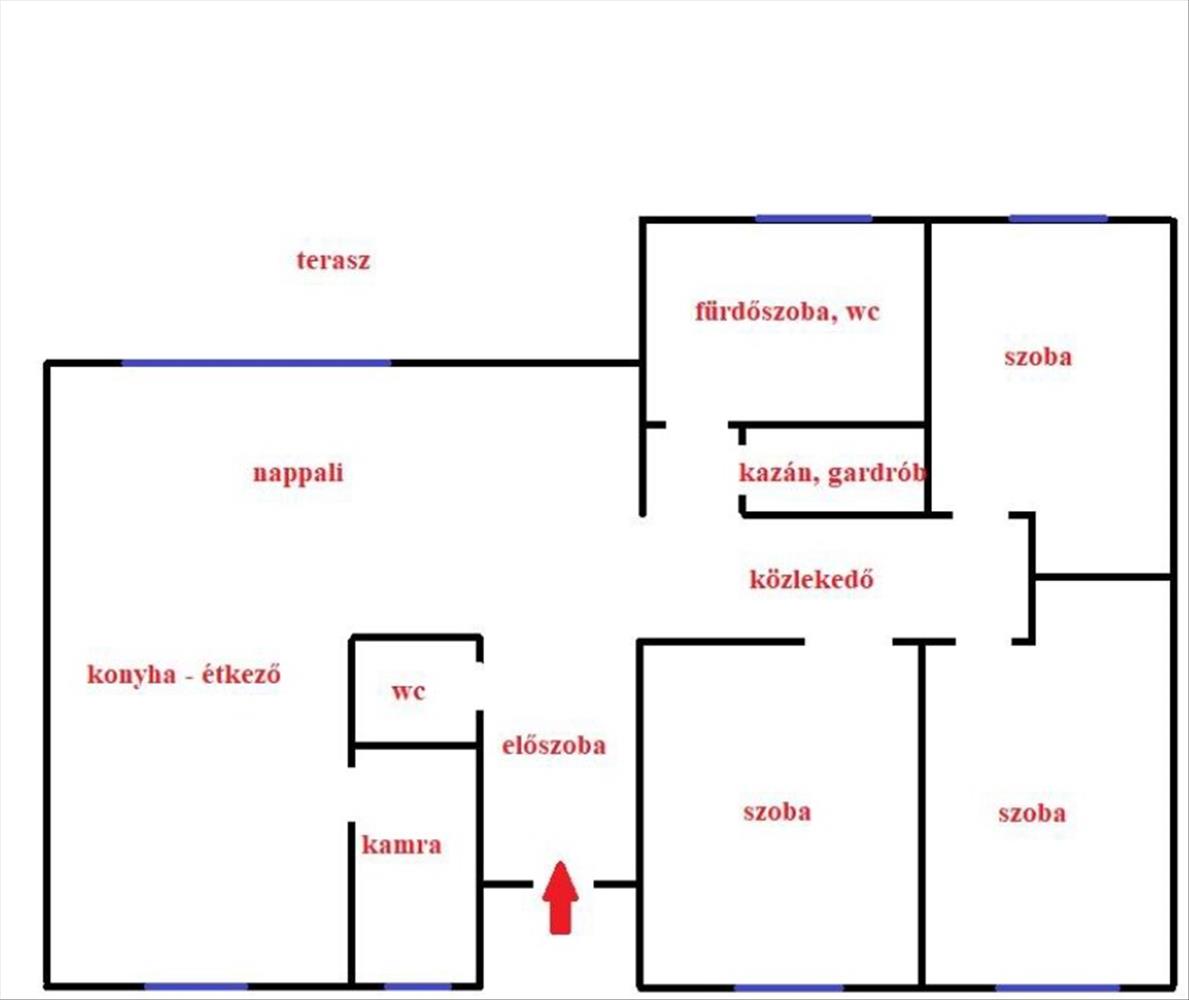 Elrendezése: előtér, 3 hálószoba, amerikai konyhás nappali, kamra, gardrób/gépészeti helyiség, fürdőszoba wc-vel, vendég wc, terasz