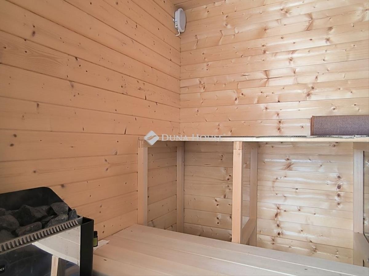 A lakóház elosztása: nappali, 1 szoba, fürdőszoba, konyha, wc, fedett terasz, szauna, fűtött pince, tároló.