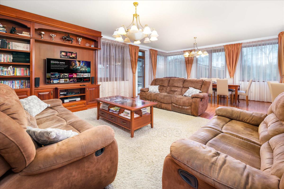 Elosztás: földszint: szoba + fürdő, wc + gardrób + wc + háztartási helység + fitnesz szoba + előszoba + amerikai konyhás nappali dolgozó sarokkal.