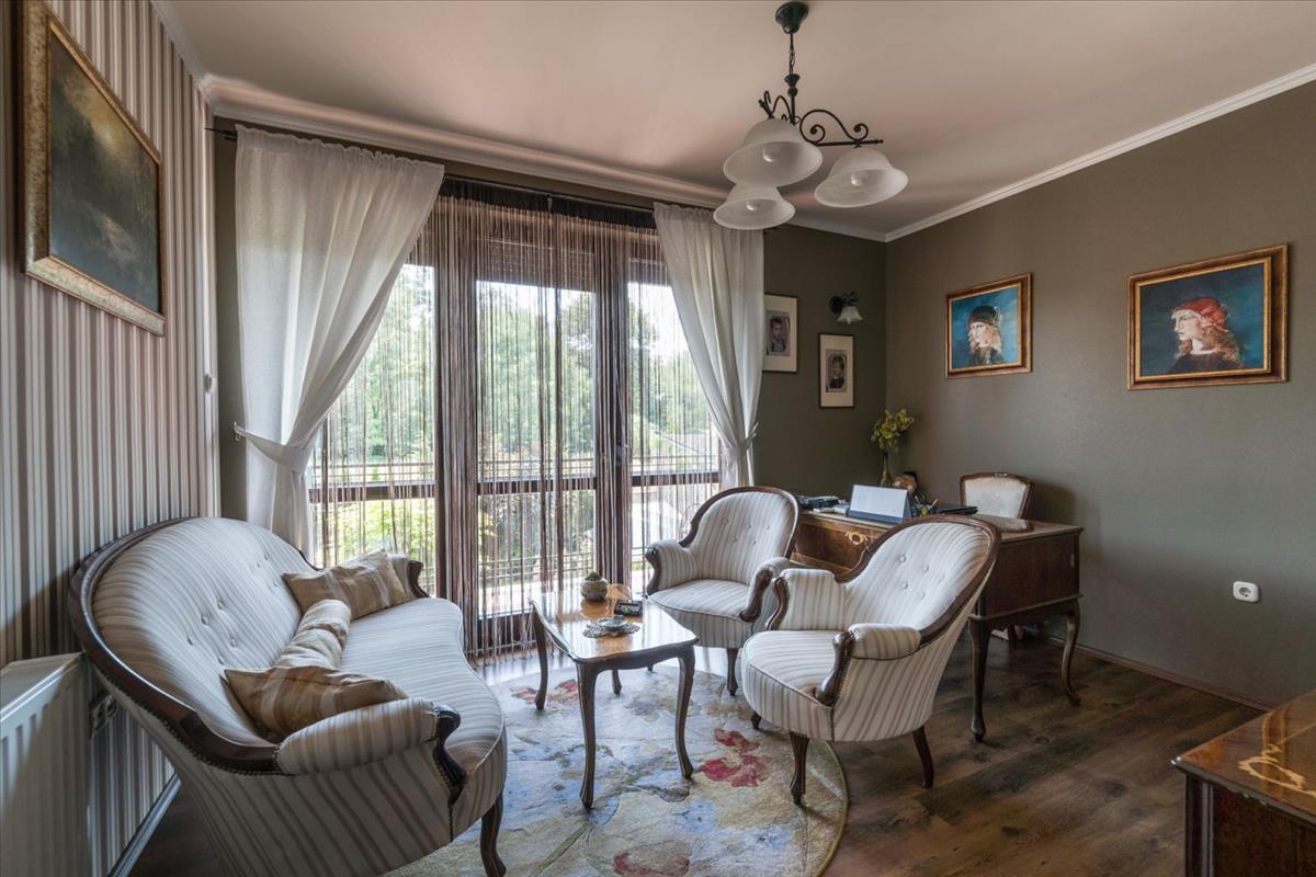Die eleganten, klassischen Stilmerkmale, die das ganze Haus überspannen, kehren in jeden Zimmer, Korridoren und Räumen zurück. Die künstlerische Tapeten, das schmiedeeiserne Treppengeländer und die Echtholz-Möbelstücke machen alle Winkel der Immobilie individuell.