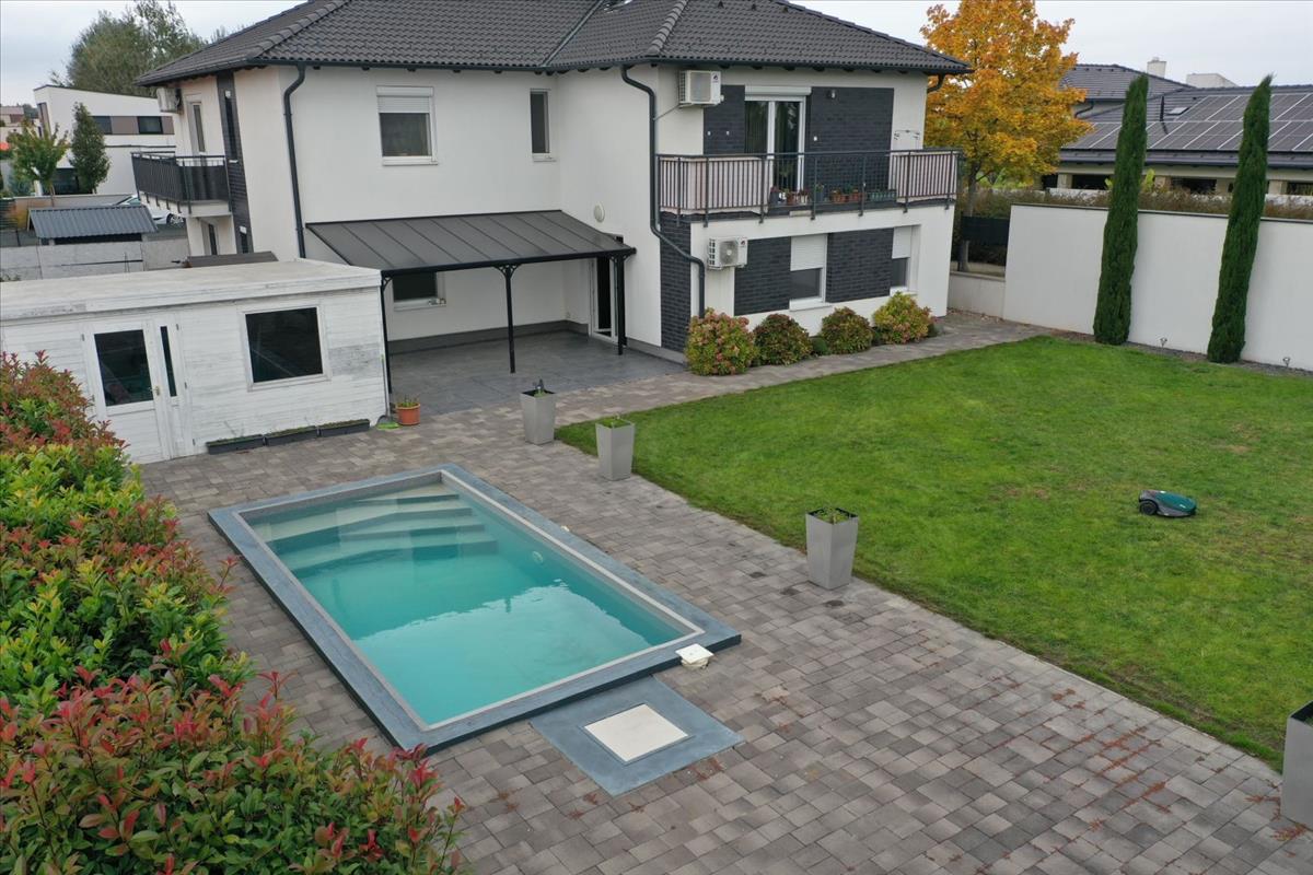 Kiemelkedően igényes környezetben, 61 m²-es, 2 szoba + nappalis lakás eladó, 350 m² saját kerttel, 25 m² terasszal, medencével, 20 m²-es kerti faházzal és 2 gépkocsibeállóval.