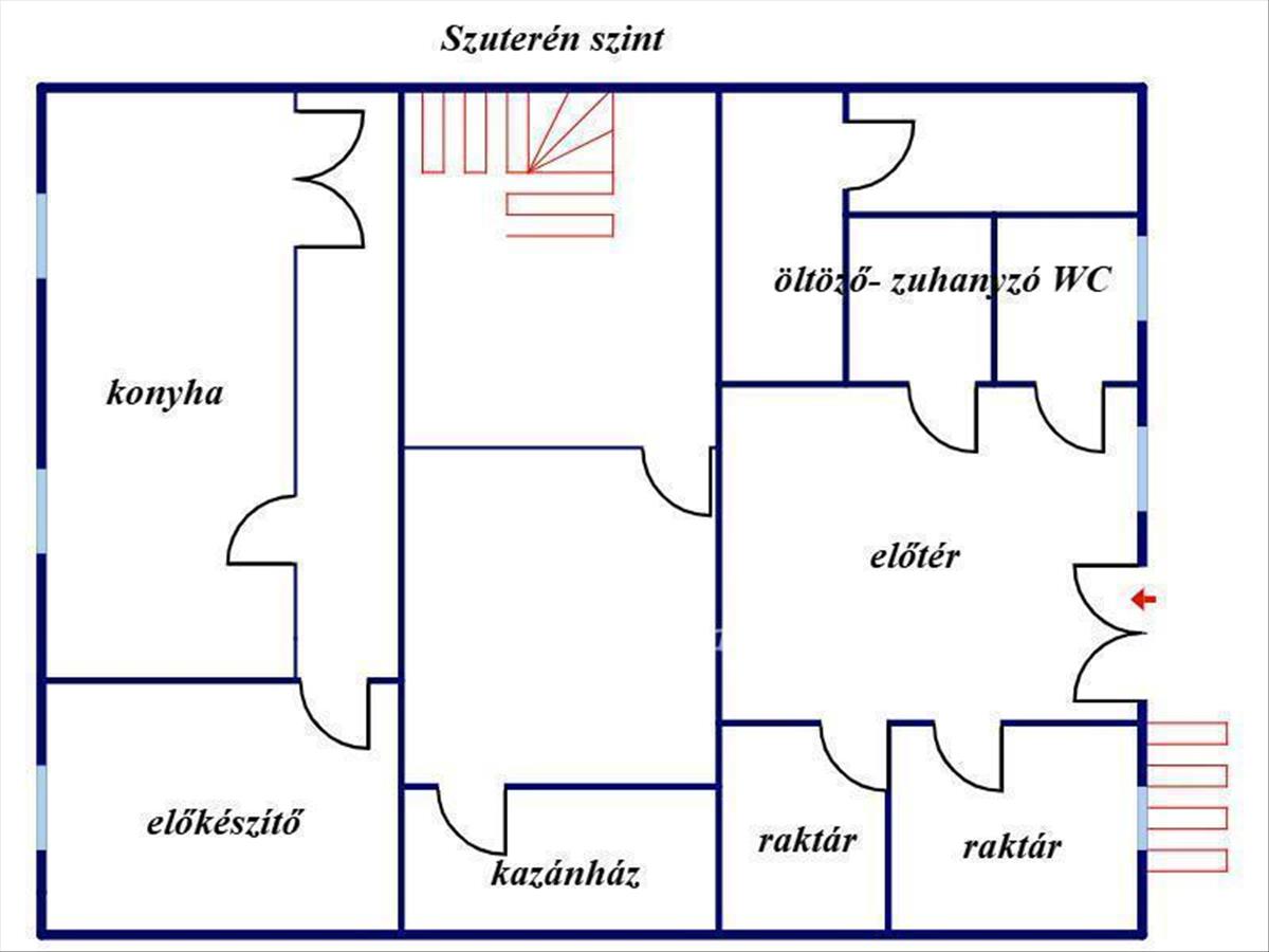 Szuterén: a korábbi éttermi konyha helyiségei (konyha, raktárak, öltözők, vizesblokk), valamint a kazánház kapott itt helyet