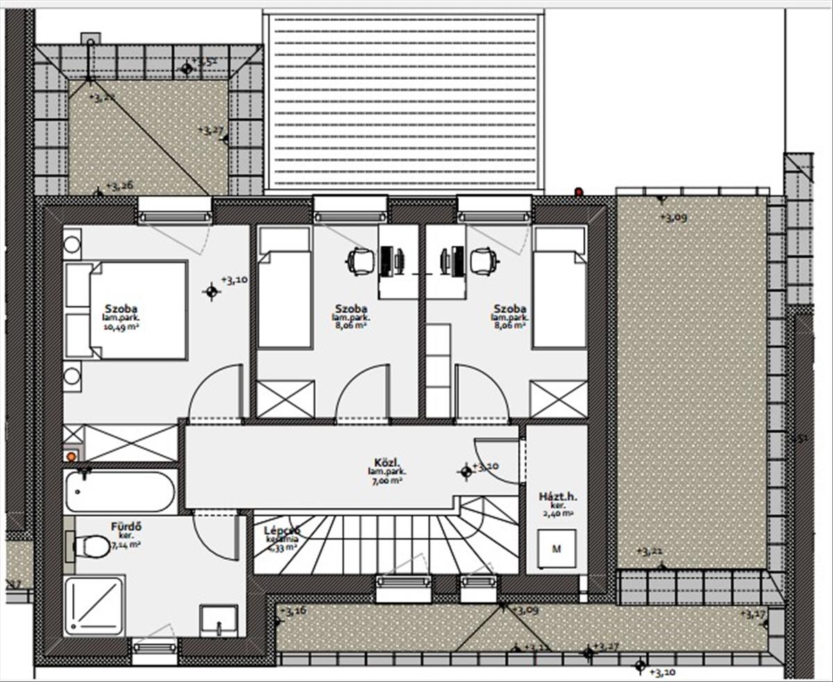 Tagolása: földszinten - előtér, wc, étkező, konyha, nappali, tároló, terasz, emeleten - lépcső, 3 hálószoba, fürdőszoba wc-vel, háztartási helyiség, közlekedő