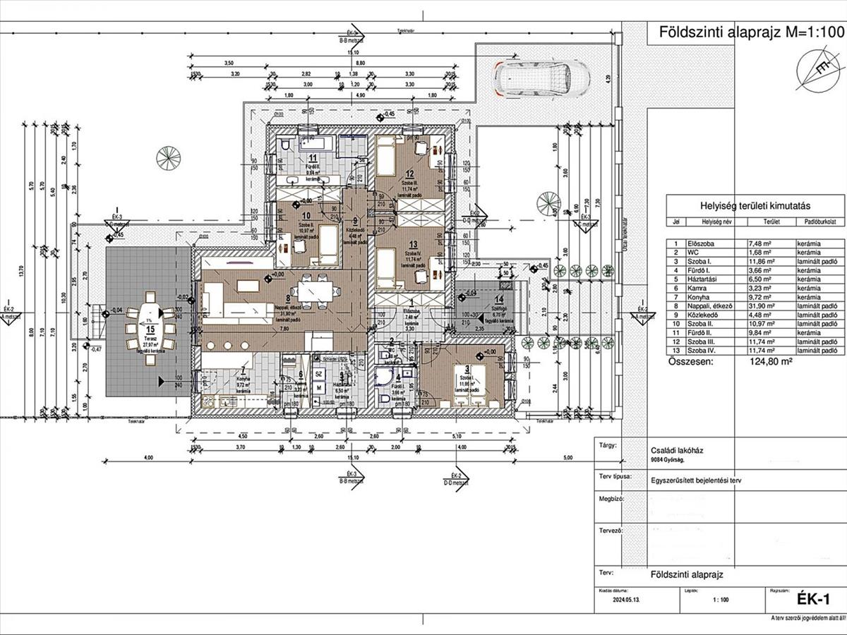 A 124, 8 m2-es ház helyiségei: tágas amerikai konyhás nappali, kamra, 3 hálószoba, 1 szülői háló saját fürdőszobával, fürdőszoba, wc, háztartási helyiség, közlekedő, , szélfogó.