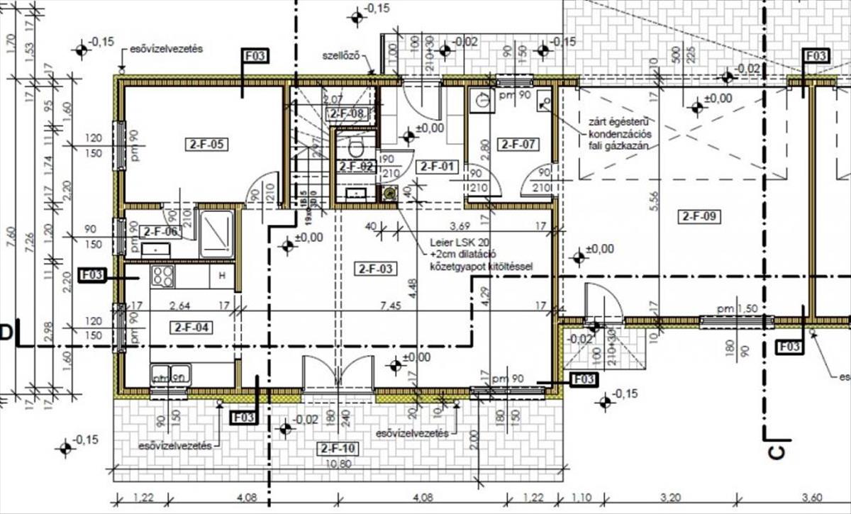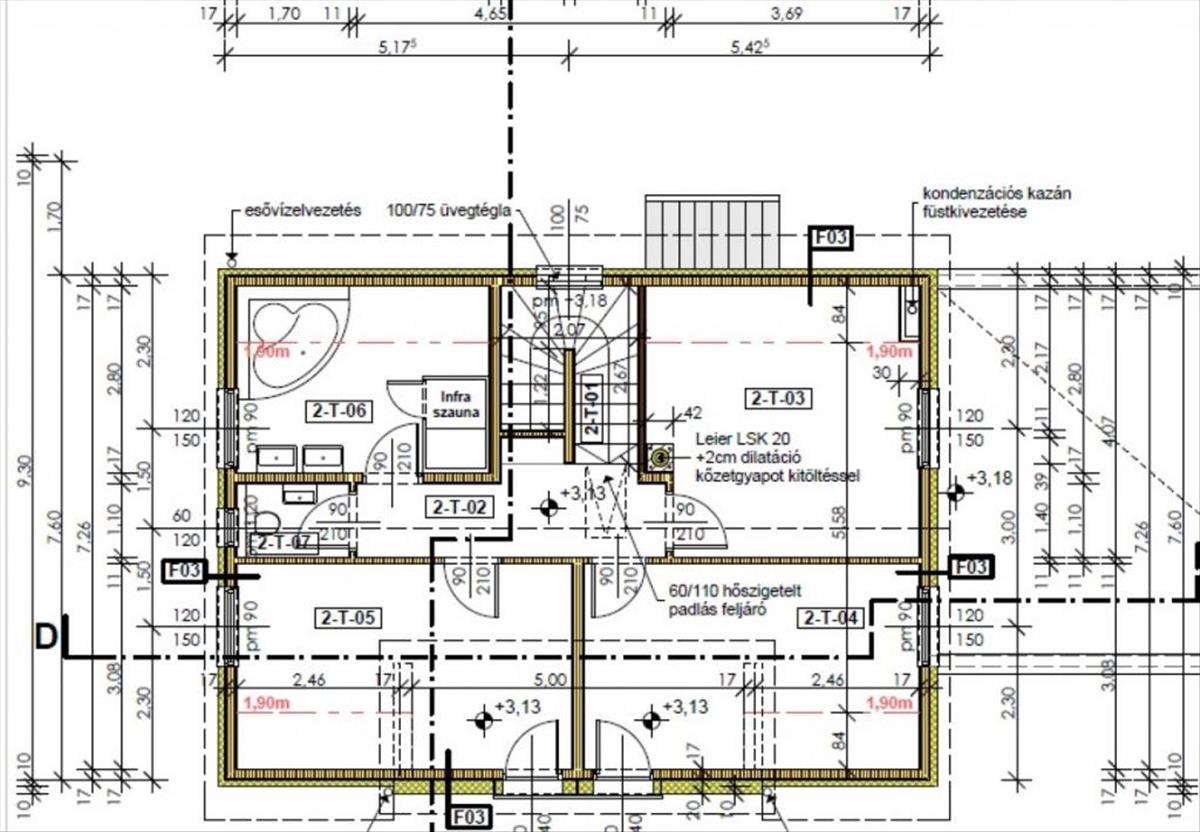 Tagolása: földszinten - szélfogó, wc, nappali étkezővel, konyha, szoba, fürdőszoba, háztartási helyiség, lépcső, a tetőtérben pedig - közlekedő, 3 szoba, gardrób, fürdőszoba, wc.