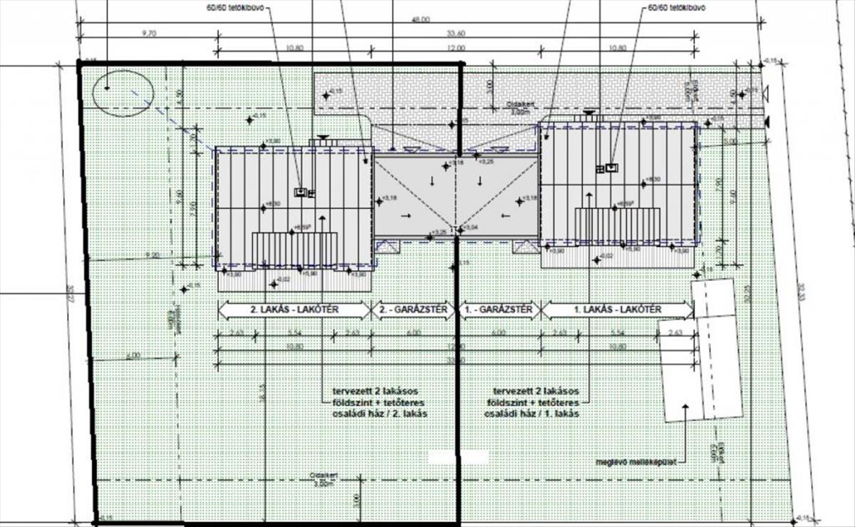 A telek adottságai kiválóak, utcafrontja 32 m széles, mélysége közel 50 m.