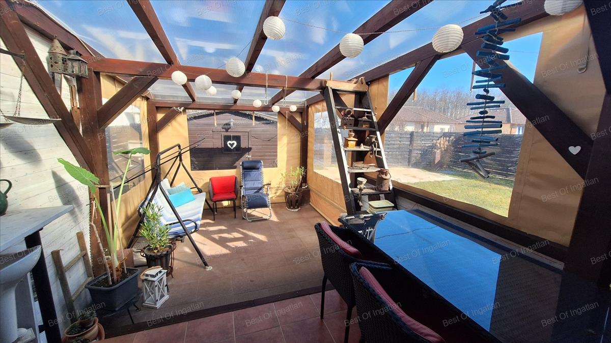 A nappaliból nyíló, fedett terasz valóban kibővíti az életteret, kávézás közben a Sokoró-domdság látképében gyönyörködhetünk. A téliesíthető terasz a hűvösebb hónapokban is nagyszerűen kihasználható, tavasszal pedig már az első napsugaraknál ideális helyszíne lehet családi és baráti összejöveteleknek.