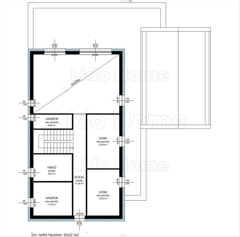 EMELET: 2 hálószoba, 2 gardrób, fürdőszoba + wc, közlekedő