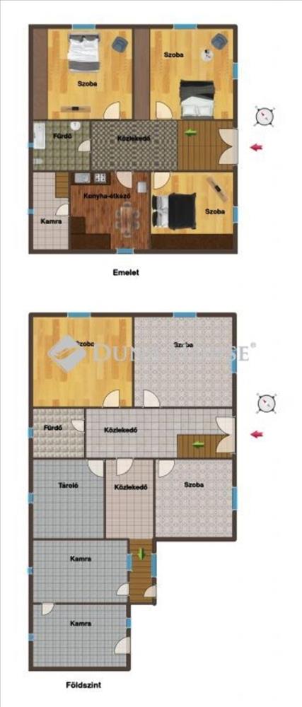 - felső rész: közlekedő, 3 db szoba, konyha ékezővel, kamra, fürdőszoba WC-vel,