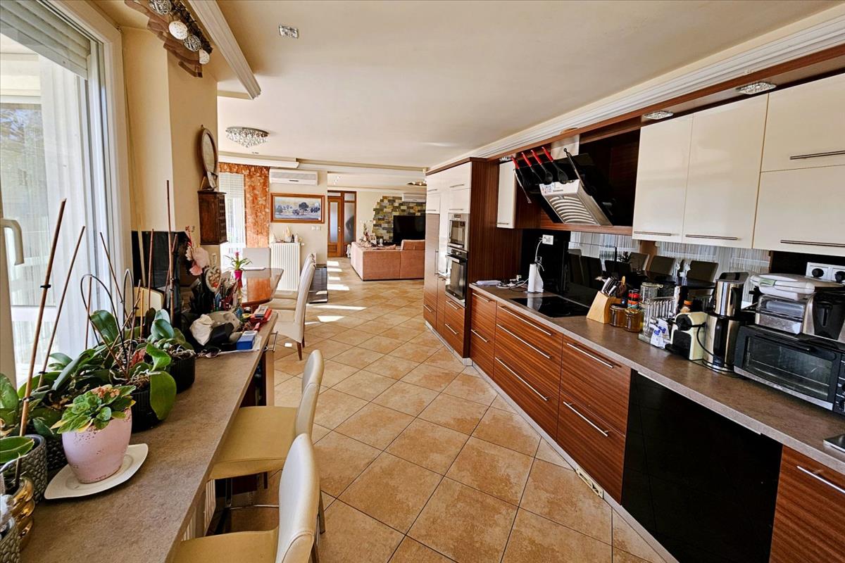A családi ház 292 m2-en elegendő életteret biztosít akár egy nagyobb család mindennapjaihoz, akár több generáció együttélésére, vagy akár családi vállalkozás működtetésére is. Az egyedi alaprajzi tervezésű épület földszintjén, mely 164 m2, egy elegáns fogadó rész található gardróbbal, ahonnét egy dolgozó szoba nyílik. a hatalmas, elegáns nappali helység terasz kapcsolatos, napfényben úszó étkező résszel csatlakozik a konyhához, ahonnét praktikusan kijárat is van. Tágas folyosórész vezet a földszinti lakrészhez. a hálószoba gardrób-kapcsolatos, a fürdőszoba káddal, zuhanyzóval, szaunával minden igényt kielégít.