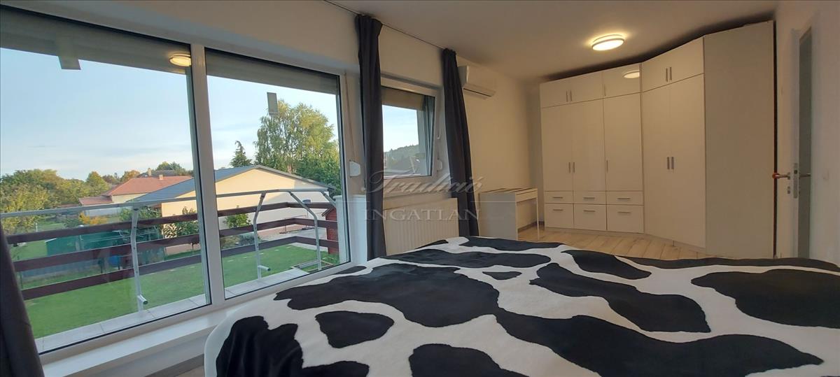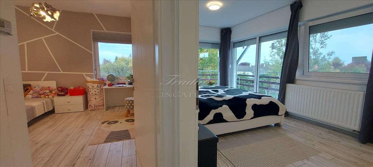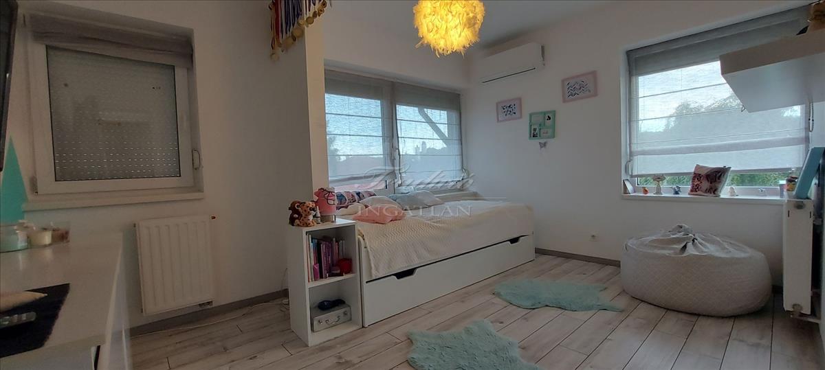 A tágas, nagy üvegfelülettel rendelkező napfényes nappali közvetlenül kapcsolódik az étkezőhöz és a vele egylégterű modern-gépesített konyhához, így a családi együttlétek természetes központja a tér. Az elrendezés átgondolt: négy különnyíló hálószoba, háztartási helyiség, gardrób, valamint két fürdőszoba és külön mellékhelyiség is szolgálja a kényelmet. Az emelet teljes értékű, nem tetőtér-jellegű, így minden szoba szellős, világos és valódi élettér. a két tágas erkélyről páratlan kilátás nyílik a győrújbaráti dombokra.