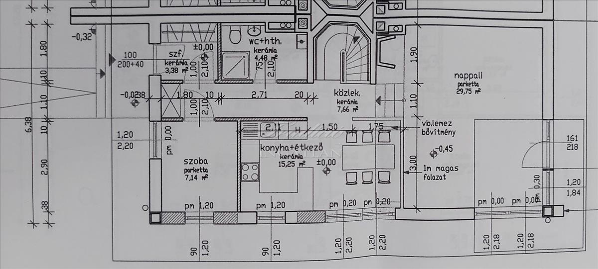 A helyiségek elrendezése és pontos méretei az alaprajzon jól láthatók. a földszinti 7, 14 m2-es, jelenlegi háztartási helyiség akár 5. Szobaként is funkcionálhat.