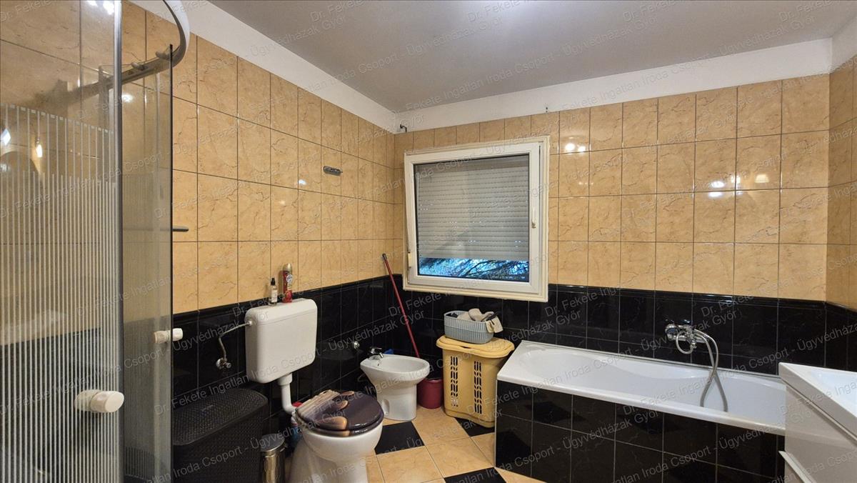 Fürdőben: kád, zuhanyzó, wc, bidé, törölközőszárítós radiátor, ablak