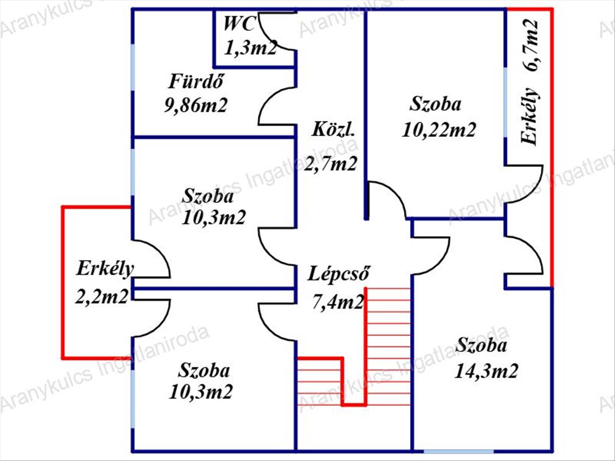 -Emelet (65, 7 m²): közlekedő, 4 szoba, fürdő, wc, 2 erkély.