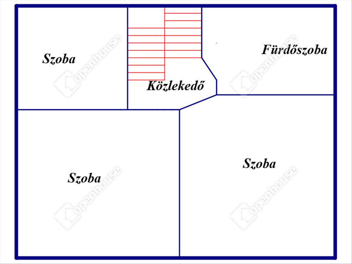 A nappaliból lépcsőn keresztül jutunk fel a tetőtérbe, ahol a három hálószoba és a tágas fürdőszoba található.