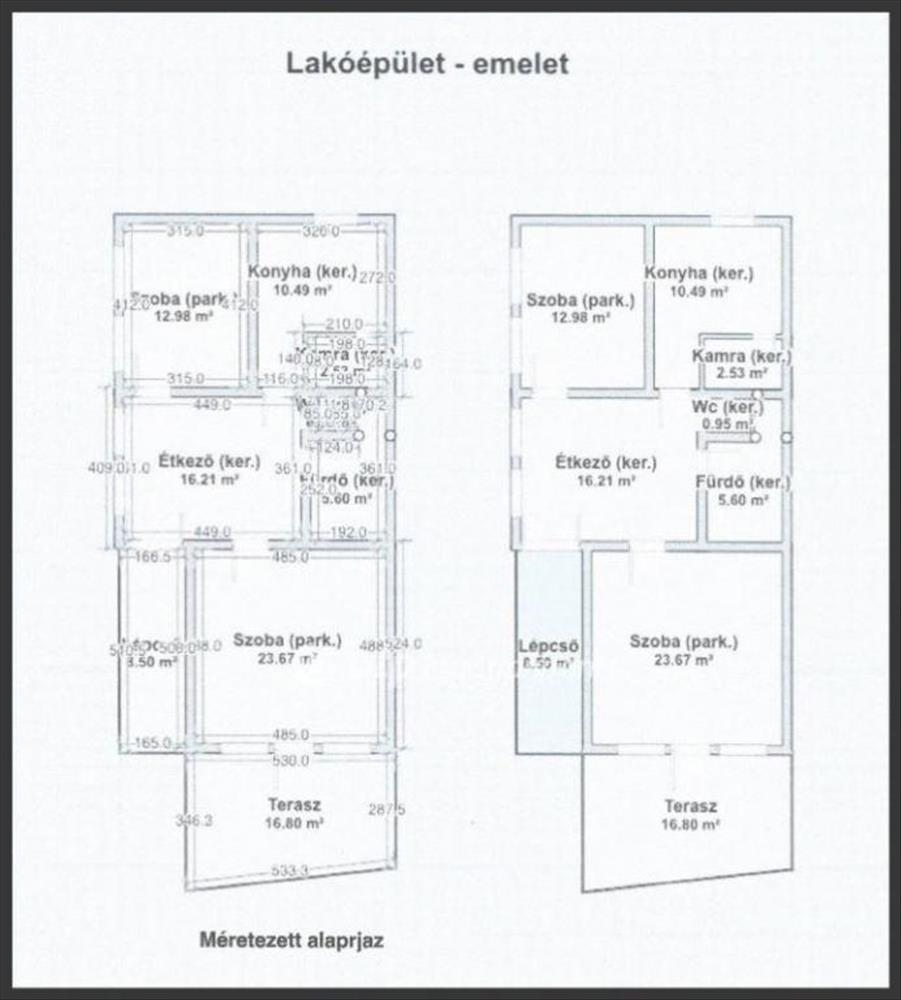 A lakóépület földszint 115 m2 kettő lakóegységgel +tetőtérben lakóegység 84 m2.