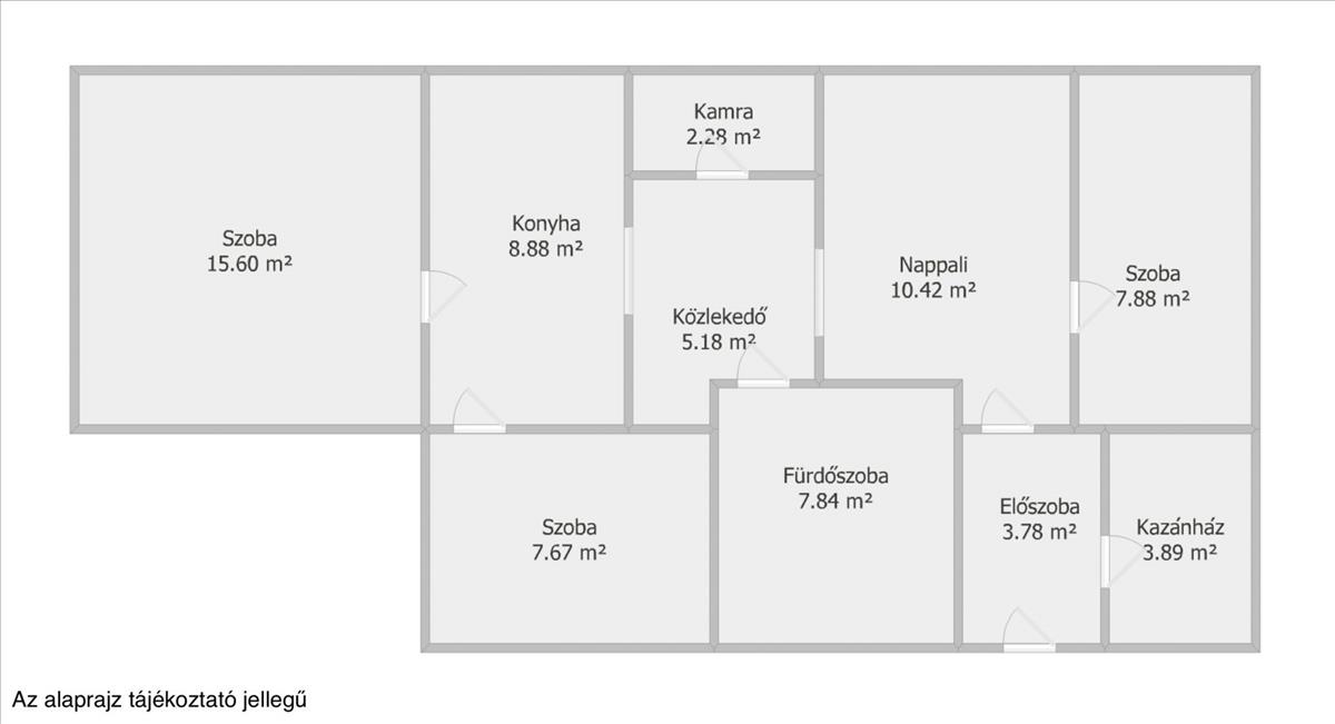 - Nappali + 3 szoba, fürdőszoba, konyha, kamra, előszoba, közlekedő, kazánház.