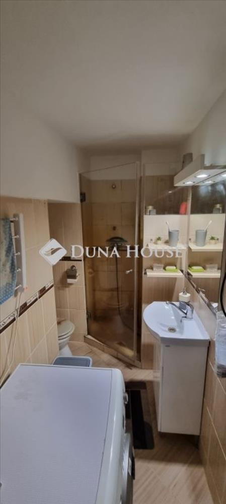 A fürdőszobában az épített zuhany és a tetszetős burkolat modern kialakítású.