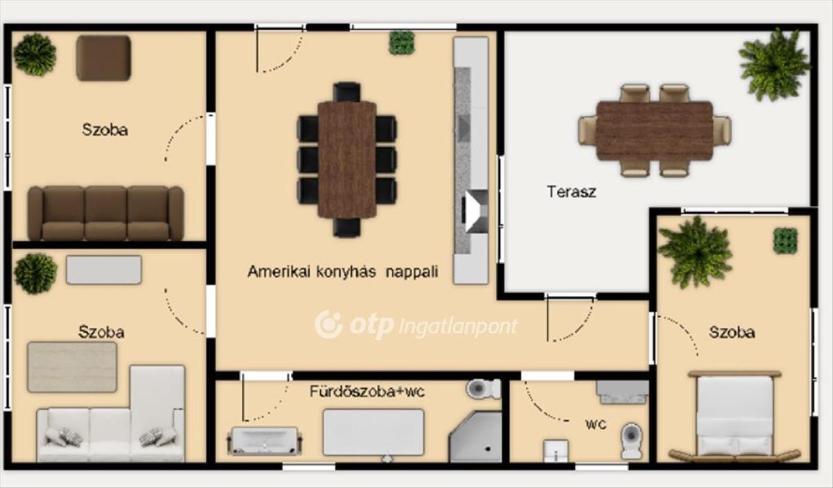 -kedvező fekvéséből eredően világos, kiváló elosztású beltérrel találkozunk amelyben : 3 szoba, amerikai konyhás nappali, közlekedő, fürdőszoba + wc, külön még egy illemhely, és kivül terasz kerűlt kialakításra
