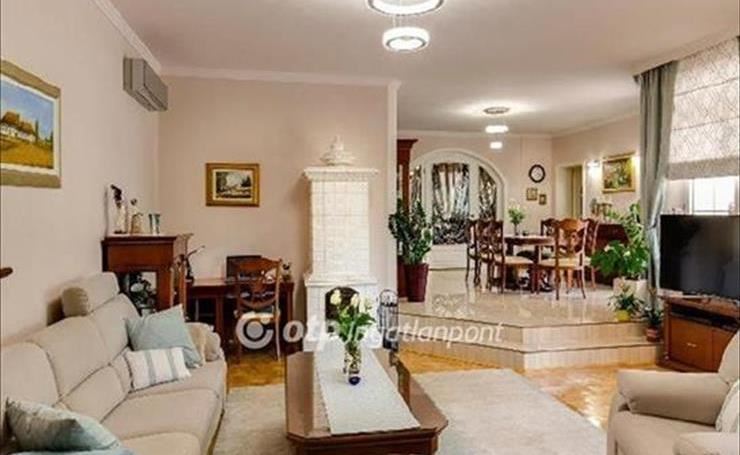 Földszinten konyha, étkező, nappali (Zsolnai cserépkályhával), 3 hálószoba, 2 fürdőszoba, medence szaunával