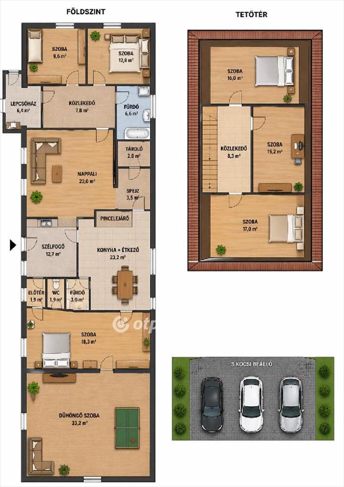 Az ingatlan egyik legnagyobb előnye a beépített tetőtér, amely jelentős plusz életteret biztosít, így ideális választás nagyobb családok vagy otthonról dolgozók számára is.