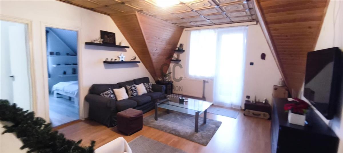 A tetőtér beépített, 4 szobára, fürdőszobára, és egy lakóelőtérre oszlik, innen kiléphetünk az 5, 4 nm-es erkélyre.