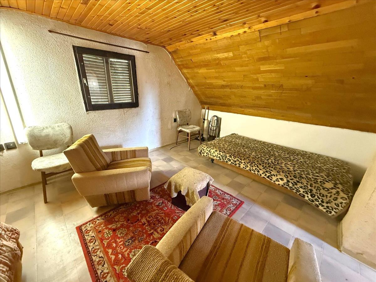 Az alsó szinten egy előtér, konyha-étkező, a felső szinten kettő egybenyíló szoba található.
