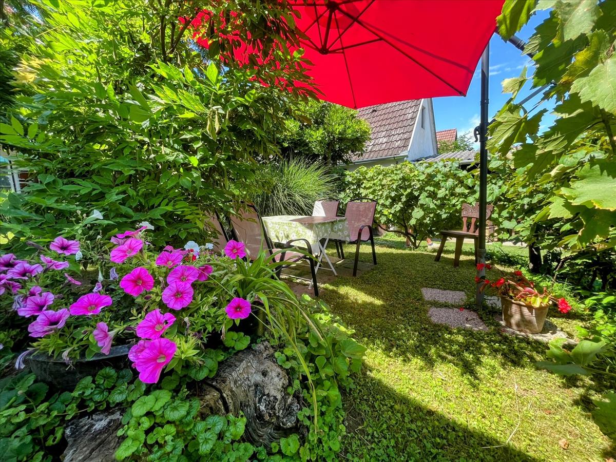 A telek nagyobb része folyamatosan karbantartott és parkosított. Ezen a részen található az aranyhalakkal teli kerti tó is. Hátrébb nagy fűszer- és konyhakert elégíti ki a mindennapi zöldség- és fűszerigényt. Természetesen gyümölcsfák is szép számmal találhatóak.