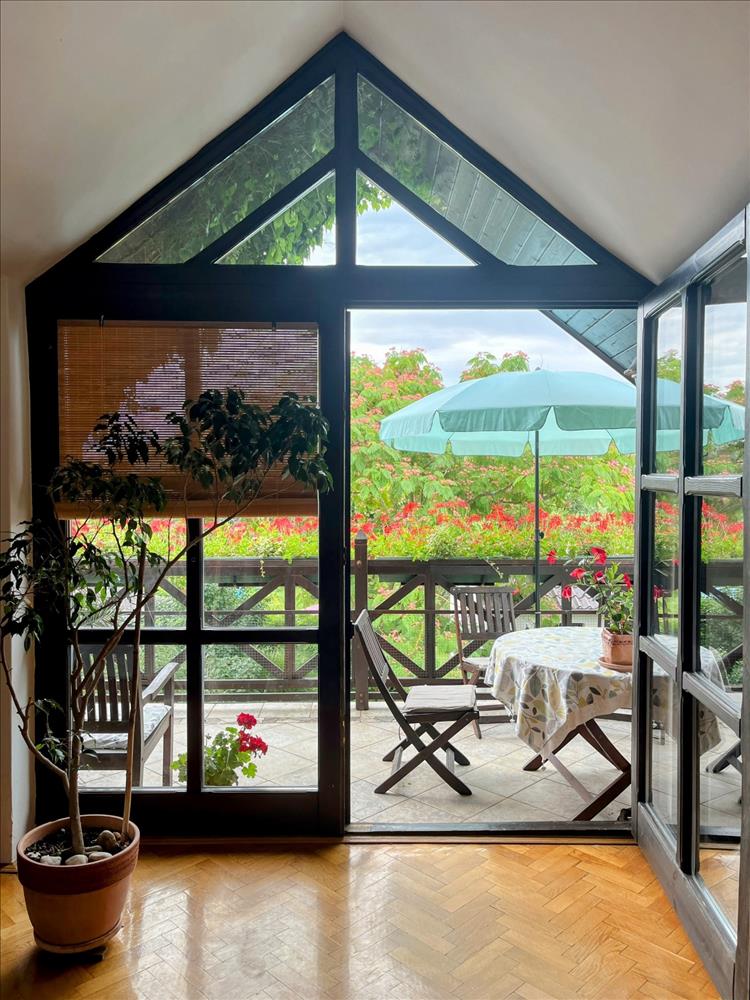 A ház felső szintjéről csodálatos panorámát élvezhet a tulajdonos, főleg a tágas nappaliból nyíló, nagy méretű erkélyről. Érdemes bejárni a házat, a felső nappali nagyon-nagyon hangulatos és fényes.
