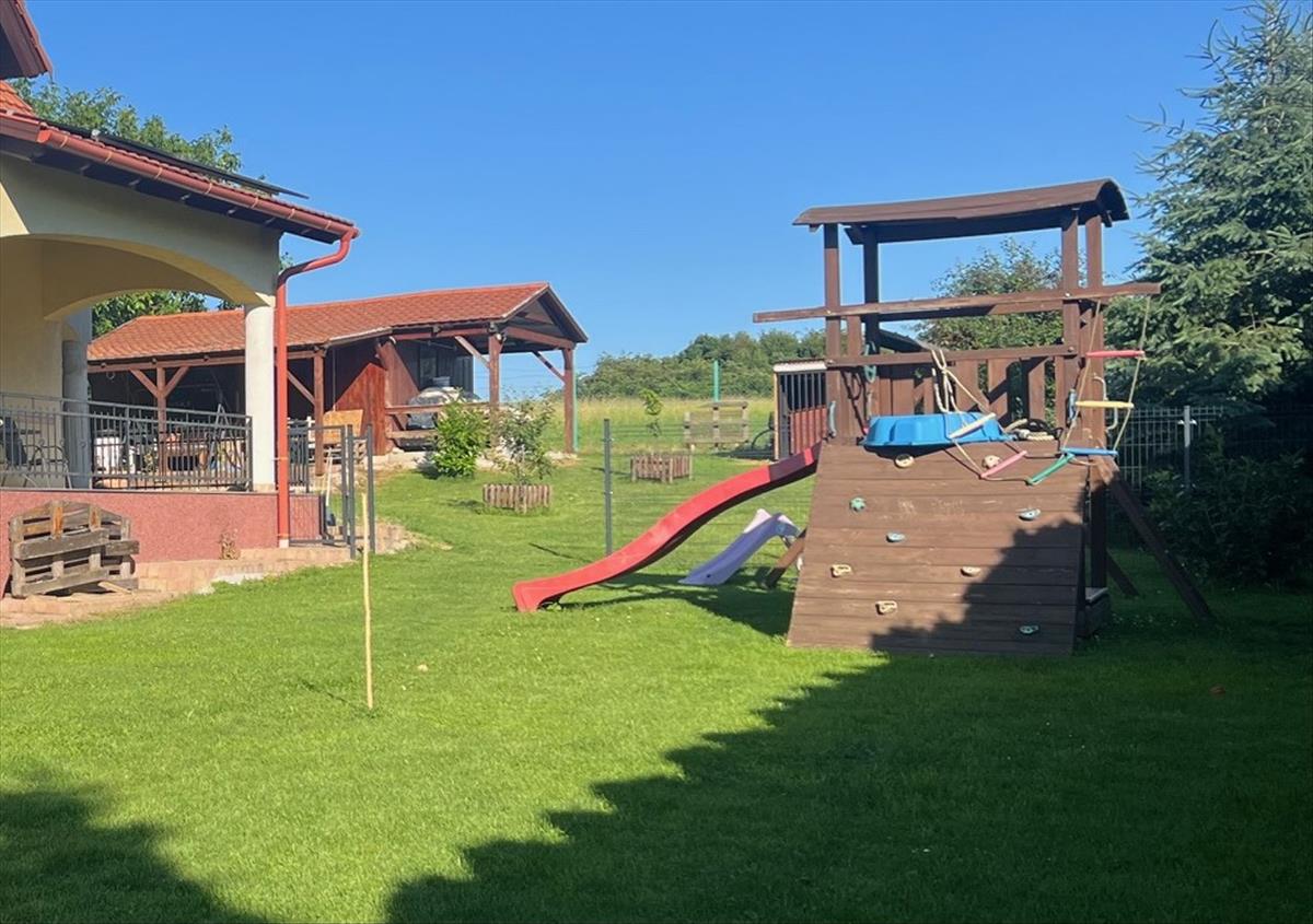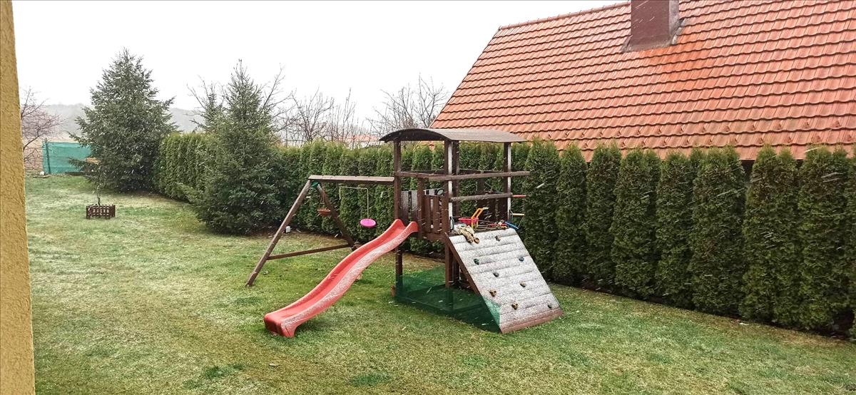 Az udvar részben térkövezett, nagy füves területtel, termő gyümölcsfákkal, játszótérrel.
