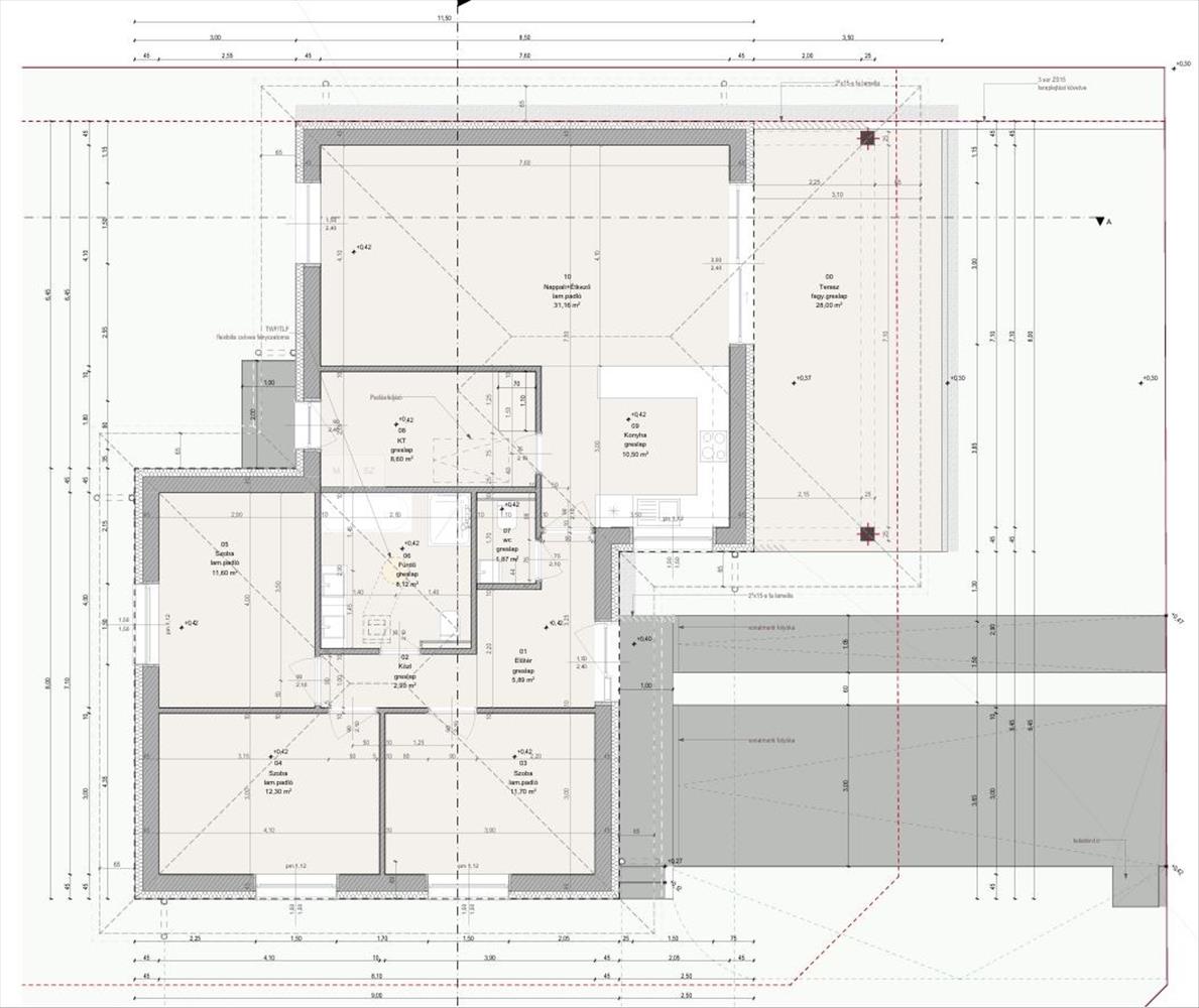 A nappaliból egy 28 m²-es teraszra léphetünk ki, ahonnan élvezhető a bakonyi dombvidék friss, nyugodt hangulata. Az autóbeálló szintén a mindennapi kényelem kiegészítője.