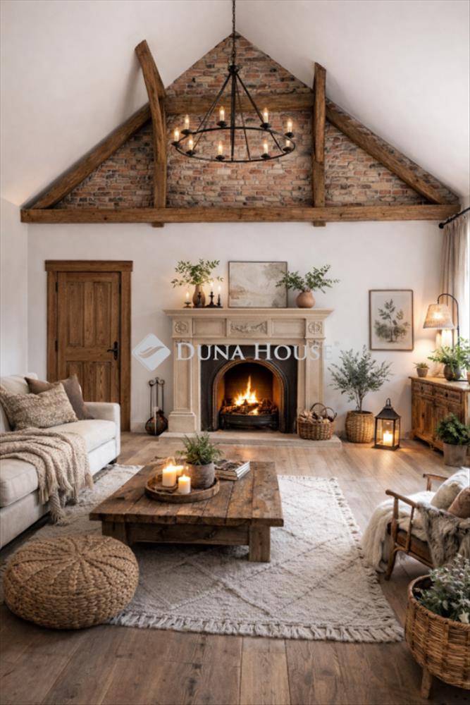 A nappali belmagassága az oromgerendáig emelkedik impozáns, levegős központi élettér, amely az egész ház hangulatát meghatározza.