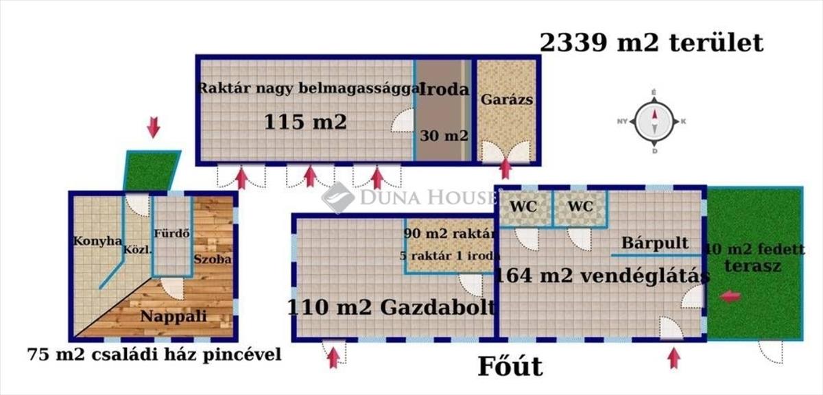 Kizárólag a duna house KÍNÁLATÁBAN! Kecskemét dinamikusan fejlődő kertvárosi részén kínálok eladásra egy 2339 m2-es, közvetlen Fő út mellett elhelyezkedő épületegyüttest, mely 4 épületből áll. Családi ház:A tégla építésű 75 m2-es ház kiváló állapotú. Cserélt hő-hangszigetelt nyílászárós, egyedi gáz(cirkó) fűtésű, teljesen alápincézett, igényes ház. Nagy étkező-nappalival, és egy teljesen gépesített konyhával rendelkezik. Tágas fürdő, és egy szoba lett kialakítva a házban. a fűtést kiegészíti egy nagy teljesítményű kandalló, és egy hűtő-fűtő klíma berendezés. a gépkocsit zárt udvari beállóban, vagy igény szerint garázsban lehet elhelyezni. Gazdabolt:A tégla építésű, 200 m2-es, jelenleg is jól működő gazdabolt 110 m2-es eladótérrel rendelkezik. Ebből nyílik a 90 m2 területű 5 raktárból, és 1 irodából álló kiszolgáló rész. Az épület fűtése gáz konvektorokkal történik, melyet kiegészít a hűtő-fűtő klíma berendezés. Az épület kiváló állapotú, 3 fázissal ellátott villamosrendszerrel felszerelt. Vendéglátó egység:A kiváló állapotú 134 m2-es tégla építésű, teljes berendezéssel ellátott üzlethez tartozik egy közel 50 m2-es fedett kerthelyiség, és egy 30 m2-es emeleti privát társalgó is. a remek elrendezésű üzletnek szeparált, férfi-női mosdója is van. a fűtésről gáz konvektorok, és hűtő-fűtő klíma gondoskodik. a biztonságról kamerarendszer gondoskodik. Raktár:Nagy belmagassággal rendelkező tégla építésű 19x6 méteres közel 115 m2-es több beállású raktár. a raktárhoz tartozik egy kb. :30 m2-es iroda is. a raktár mellett található egy kb. :30 m2-es garázs. TOVÁBBI információért kérem keressen! FIX 3% lakáshitelre megvehető