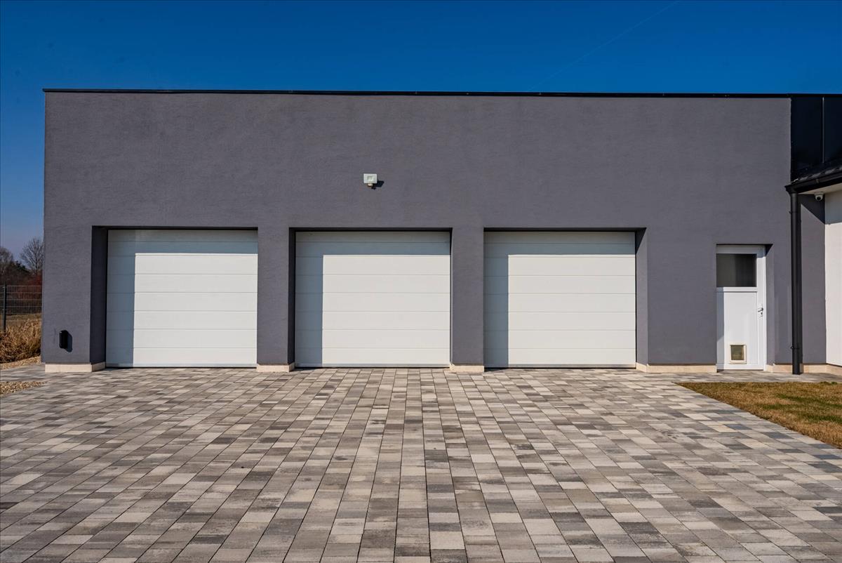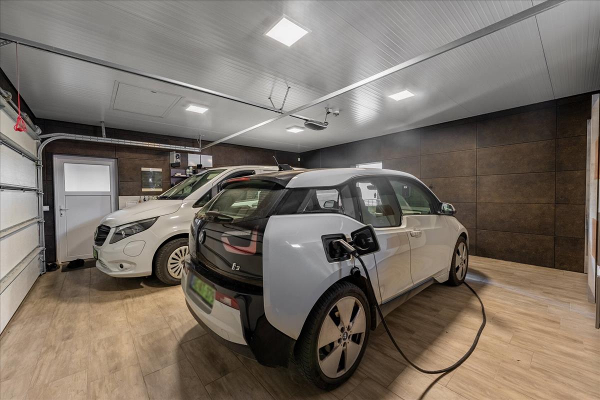 A családi házba belépve az előszobába érkezünk, melytől jobbra közelíthetjük meg a két beállásos garázst, mögötte pedig elhelyezkedik még 3-db garázsbeálló.