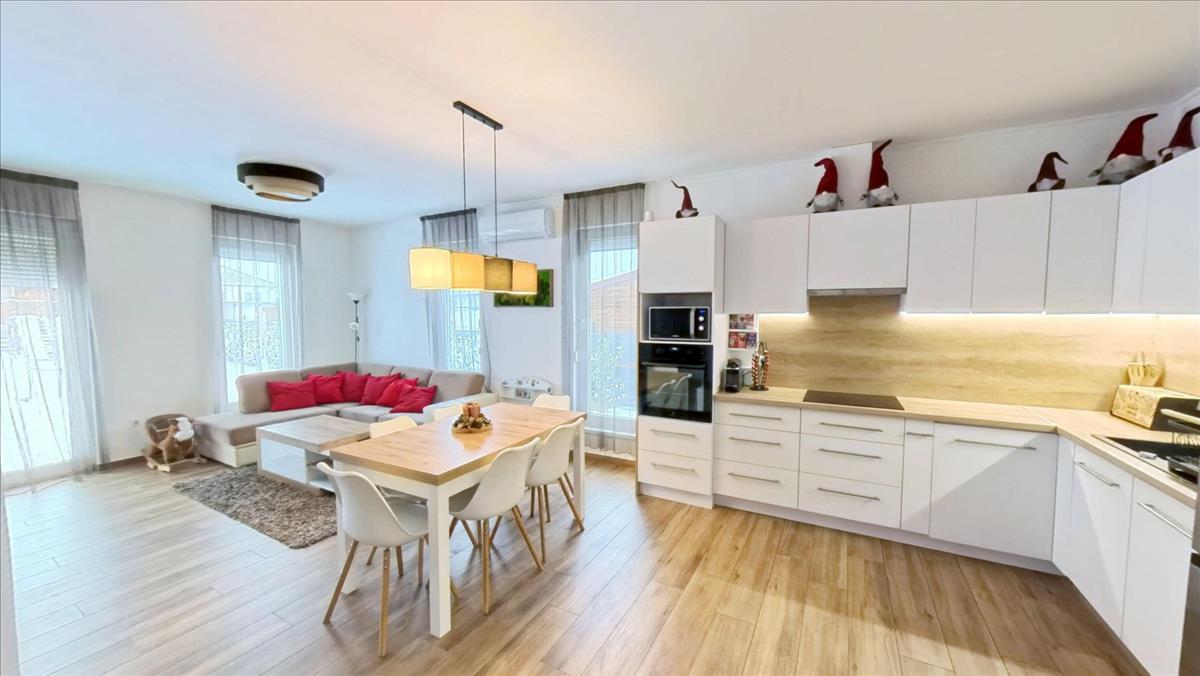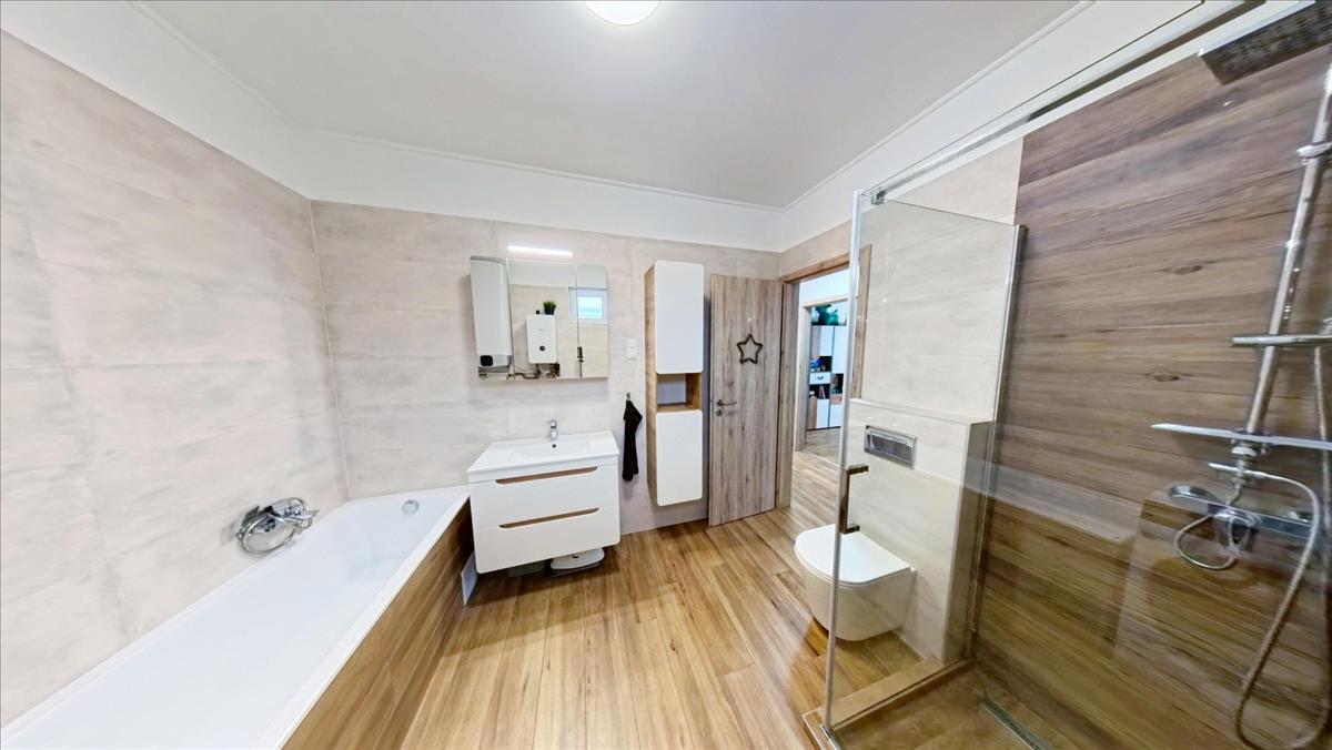 A fürdőszobában kapott helyet a bosch elektromos kazán és az ariston okos villanybojler is. a bejárattól jobbra a konyha-étkezőbe juthatunk, amely egy légtérben van a nappalival. a konyhában egyedi tervezésű, igényesen beépített, modern konyhabútor van, melyben minden fontos konyhai gép (Elektrolux sütő és indukciós főzőlap, Bosch mosogatógép, szag elszívó) beépítésre került.