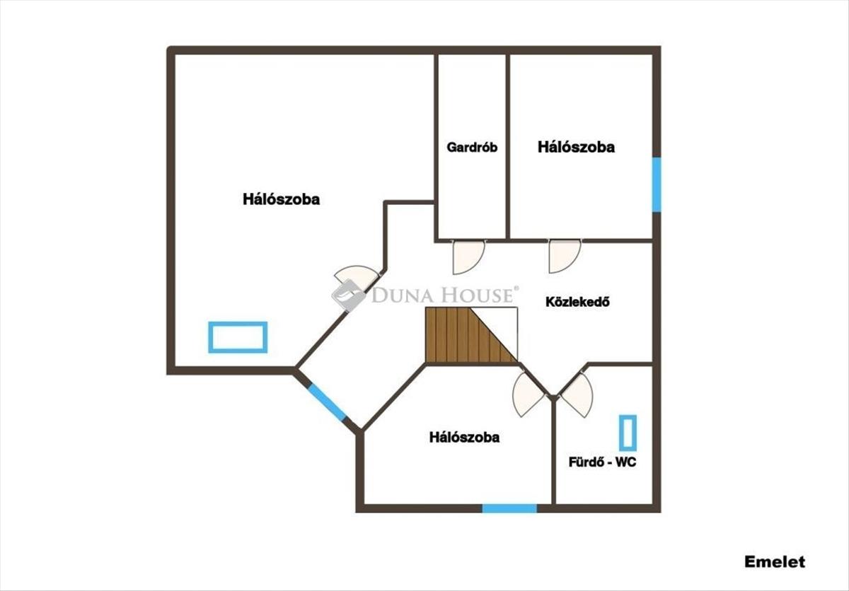 az emeleten 3 hálószoba, gardrób, fürdő